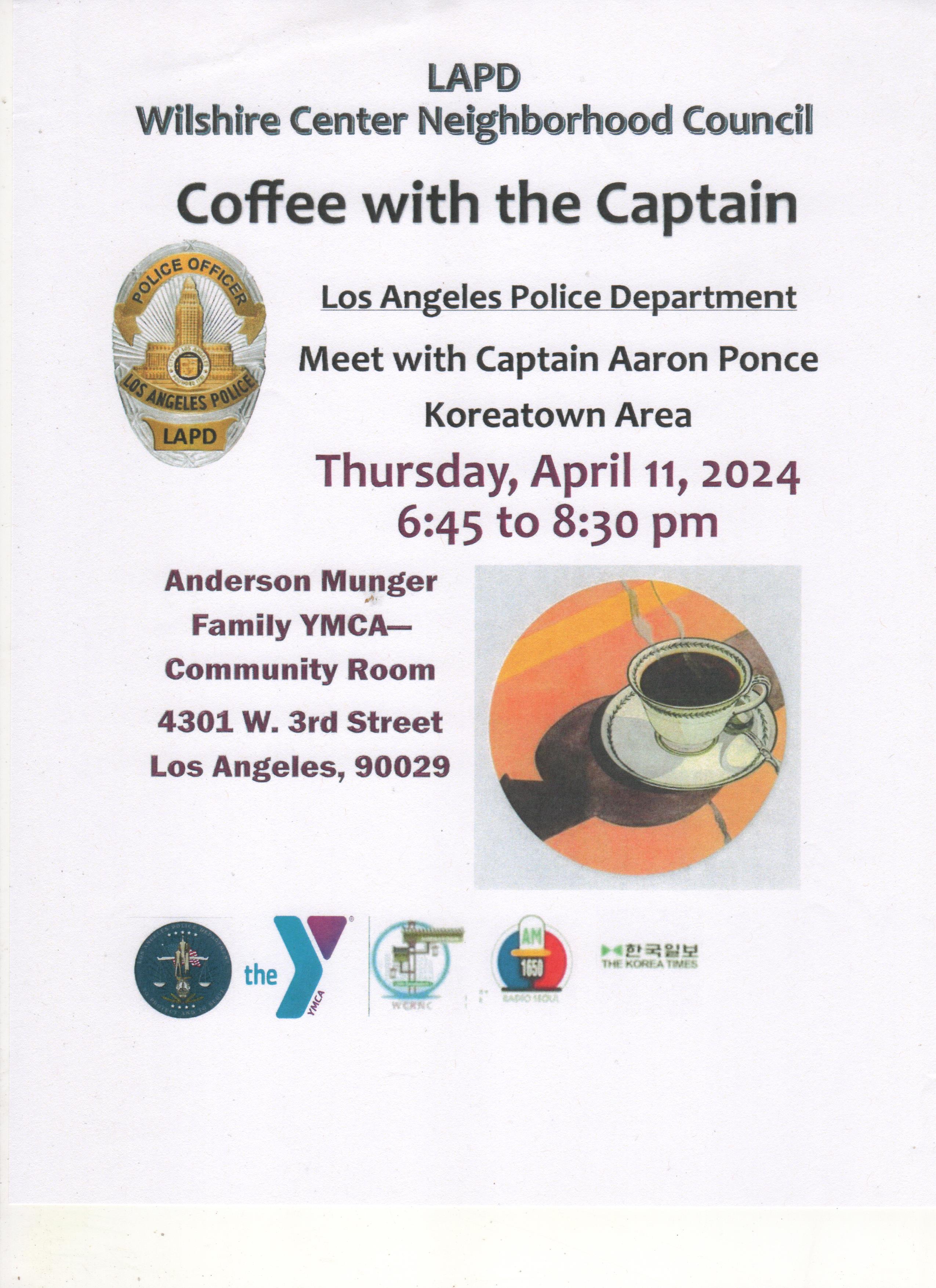 11 April 2024, 6:45 - 8:30 pm, Coffee With The Captain, YMCA 3rd St & Oxford